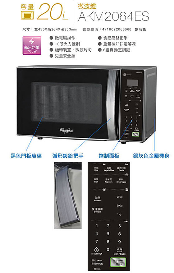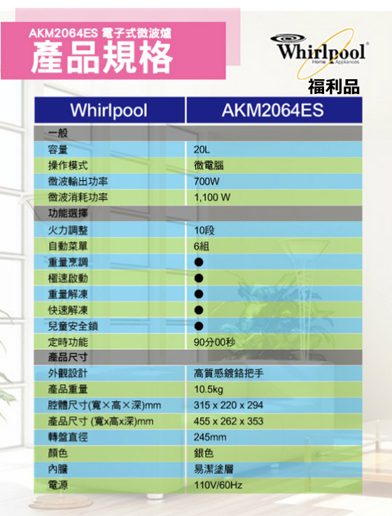 品名:Whirlpool惠而浦-20公升電子式微波爐(AKM2064ES)(福利品)