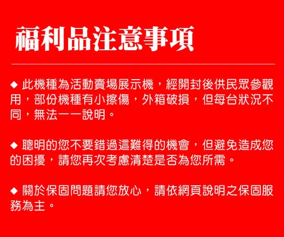 ※福利品主機表面可能有少許瑕疵擦痕、外箱及保麗龍破損,每台狀況不同,外觀不保固!非全新品,但貨況良好,近9成9新(請謹慎考慮後再行購買)